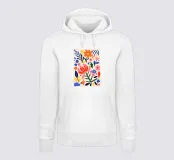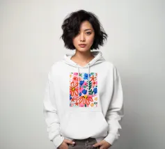 Fiori e foglie audaci e colorati sono disposti in modo casuale su uno sfondo chiaro, creando una composizione vibrante e vivace. L'uso di colori solidi e forme astratte conferisce all'opera un tocco moderno e giocoso.