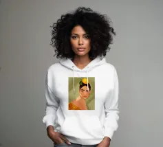 Questo dipinto ritrae una persona che indossa una camicia a righe gialle e bianche con grandi orecchini arancioni. Un piccolo uccello è appollaiato sulla spalla della persona, aggiungendo un elemento affascinante alla composizione.