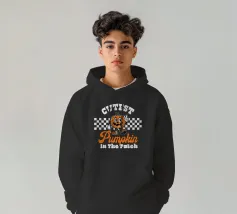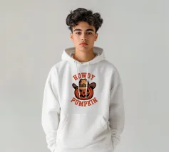 Un'allegra zucca che indossa occhiali da sole e stivali saluta, con un testo in grassetto che la proclama la "zucca più cool del campo".