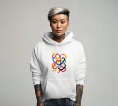 Questo disegno presenta un'intricata disposizione di linee fluide e colori vivaci, che creano un senso di movimento ed energia. Lo sfondo è neutro, per migliorare l'impatto visivo.