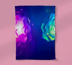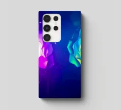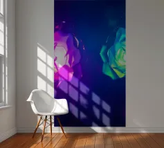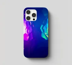 Due forme astratte di rosa sono in mostra su uno sfondo scuro, illuminato da sfumature luminose di viola e blu. Questo design artistico crea uno sfondo per telefono visivamente accattivante.