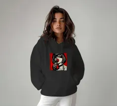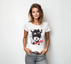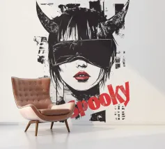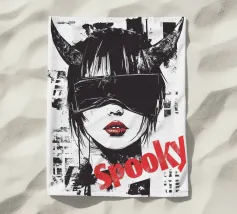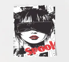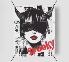 Una misteriosa demonessa con una benda e seducenti labbra rosse domina questa composizione oscuramente erotica. L'estetica grunge ricorda i manifesti punk degli anni '80, mentre la scritta "Spooky" in rosso sangue rafforza l'atmosfera di Halloween. I contrasti in bianco e nero con accenti rossi mirati creano una tensione drammatica. Questo provocatorio mix di gotico e street art trasforma la moda in dichiarazioni ribelli, perfette per chiunque ami il lato oscuro!