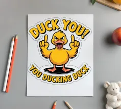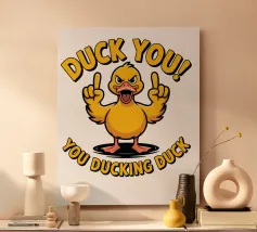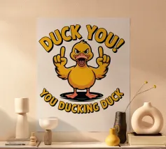 Al centro si trova un'anatra dei cartoni animati, che sfoggia un'espressione di sfida divertente e alza le ali in un gesto non convenzionale. Il testo giallo in grassetto sopra e sotto l'anatra recita un messaggio umoristico.