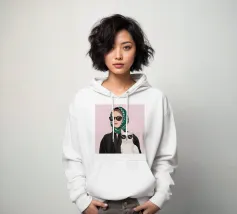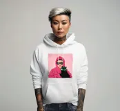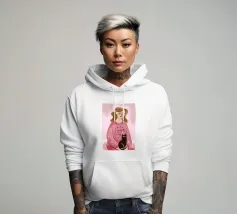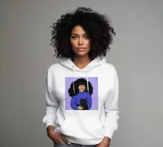 Ritratto chic e misterioso di una donna con felpa rosa acceso e occhiali da sole scuri, che tiene in mano un elegante gatto nero. I colori audaci e l'espressione fredda ed enigmatica creano una dichiarazione moderna ed elegante.