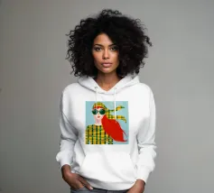 Questo vivace ritratto pop art presenta una rossa sicura di sé che indossa audaci occhiali verdi da gatta e un dolcevita giallo. Il mix di elementi retrò e moderni crea una divertente dichiarazione di intelligenza, stile e impavida individualità.