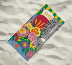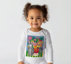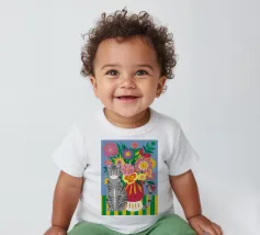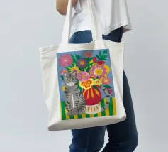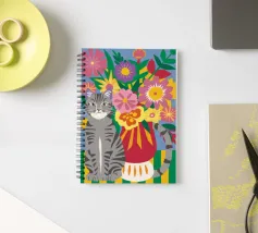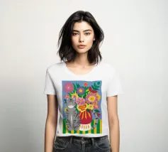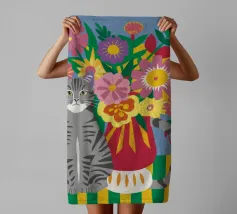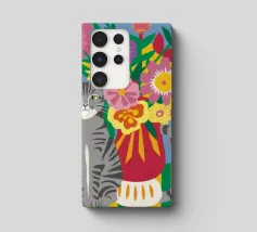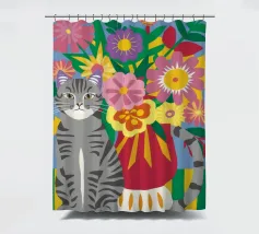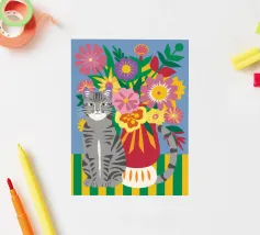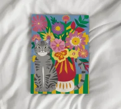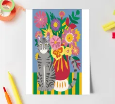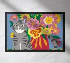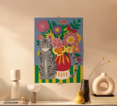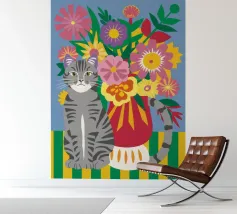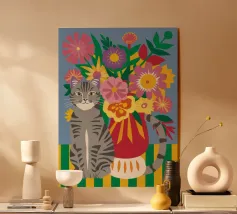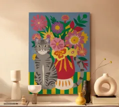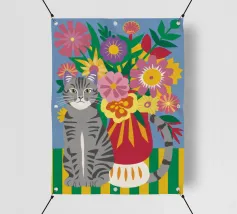 Un gatto soriano grigio siede maestosamente davanti a un vivace bouquet di fiori colorati in un vaso a righe, su uno sfondo giallo, evidenziando un ritratto di animale domestico giocoso ma regale.