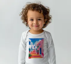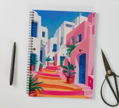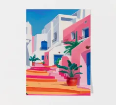 Un'incantevole e stretta scalinata in pietra in un villaggio imbiancato, ornata da cascate di bouganville rosa e rosse e piante verdi in vaso, immersa nella luce del sole.