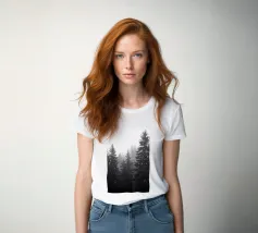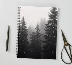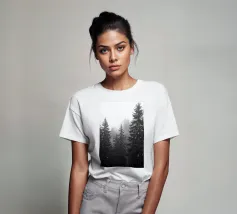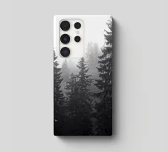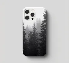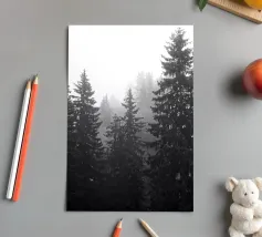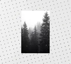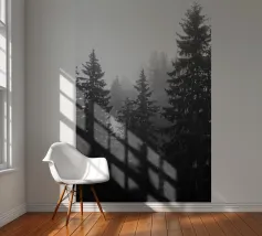 Fotografia di una foresta di conifere con abeti rossi in Austria avvolta da una fitta nebbia in bianco e nero.