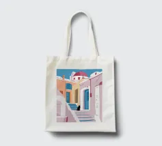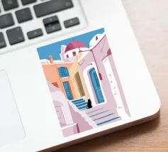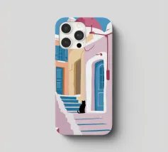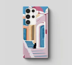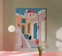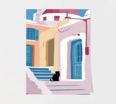 Un'affascinante scena di un gatto nero seduto sui gradini di una strada pittoresca di una città come Santorini, con la sua classica architettura bianca e blu. L'immagine è un'istantanea pacifica e iconica della vita dell'isola greca.