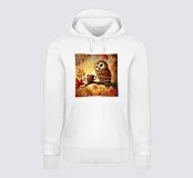 Un'affascinante illustrazione in stile cartoon di un gufo appollaiato con grazia su un ramo d'albero, circondato da vivaci foglie autunnali nelle calde tonalitĆ  del rosso, dell'arancio e dell'oro. Il gufo tiene in mano una tazza di sidro fumante, mentre la morbida luce dorata di un tranquillo tramonto illumina la scena. L'ambiente tranquillo e i dettagli stravaganti evocano l'accogliente bellezza dell'autunno.