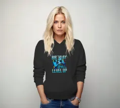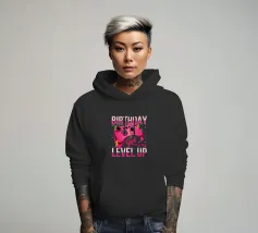 Un controller di gioco retrò è accompagnato dalla frase "Non invecchio, salgo di livello", utilizzando uno stile di carattere nostalgico. Questo design combina la cultura del gioco vintage con una visione umoristica dell'invecchiamento.