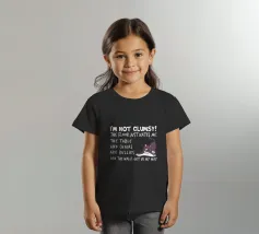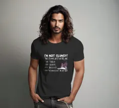 Un design giocoso presenta un gatto dei cartoni animati con una didascalia umoristica sull'essere maldestri, incolpando il pavimento, il tavolo, le sedie e le pareti per gli incidenti.