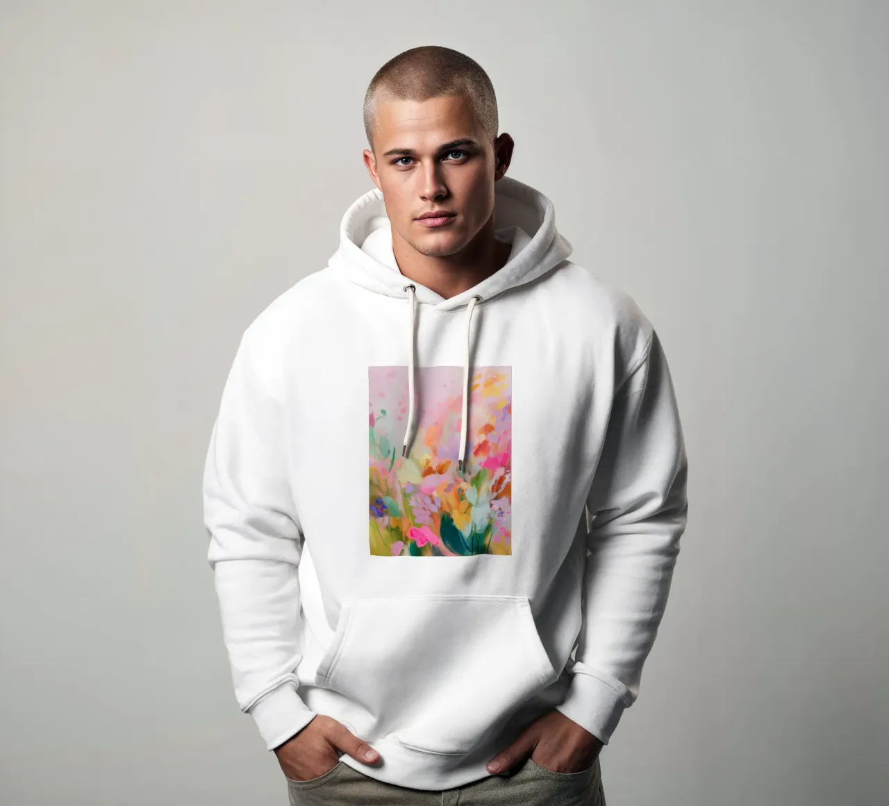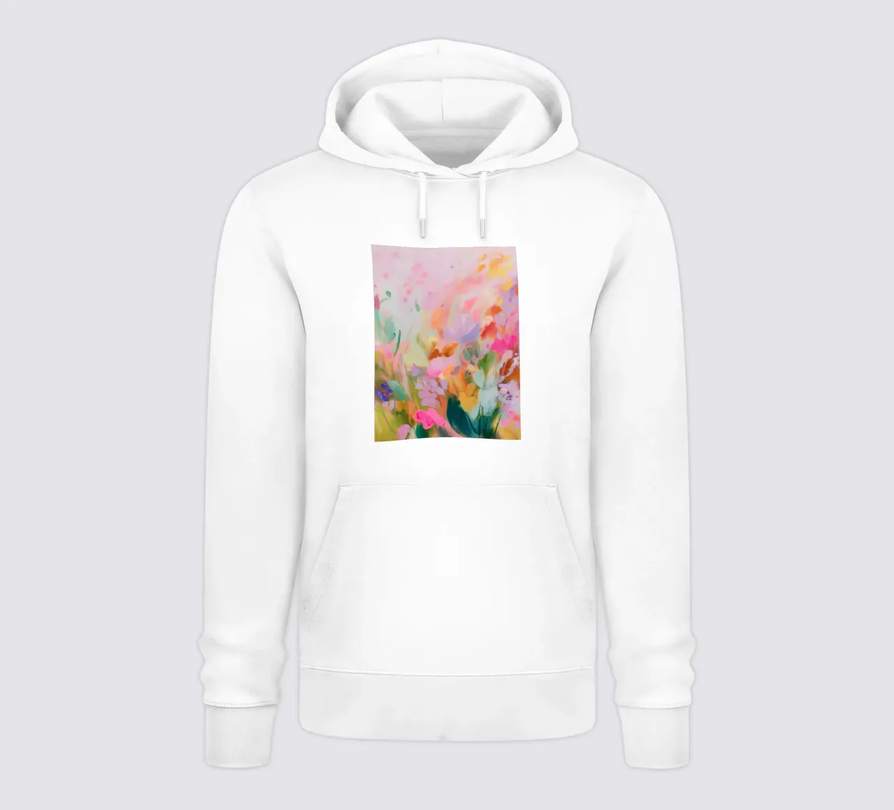 Il motivo mostra una composizione floreale dinamica e astratta, dai colori pastello decisi ma delicati. Pennellate di rosa, arancione e verde formano una moderna interpretazione di un prato fiorito estivo. La pittura conferisce all'opera profondità, leggerezza e un'aura naturale e vivace.