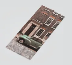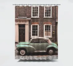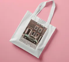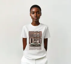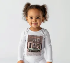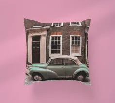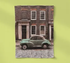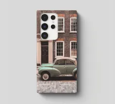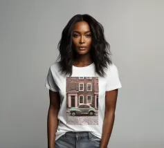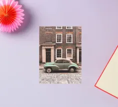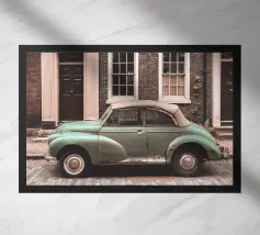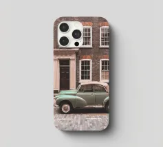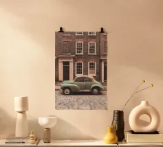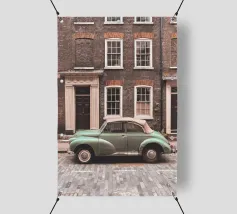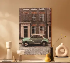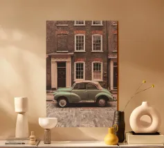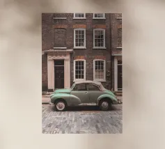 In una pittoresca strada di Londra, un'elegante auto d'epoca passa davanti a facciate di mattoni con un'atmosfera retrò e senza tempo dell'architettura britannica, mescolando storia e nostalgia urbana.