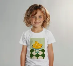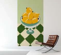Natura morta di una ciotola di vetro riempita di mango giallo maturo, su una superficie a scacchi verdi e bianchi. Lo stile è pulito, moderno e grafico.