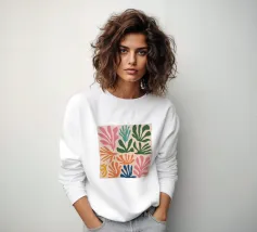 Un motivo di foglie stilizzate nei toni del verde, del rosa e della terracotta, ispirato ai ritagli di Henri Maraoui. La disposizione suggerisce una danza aggraziata di forme botaniche.