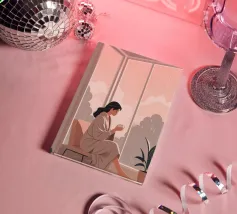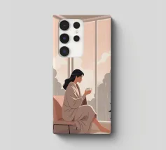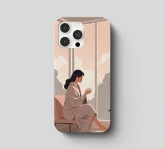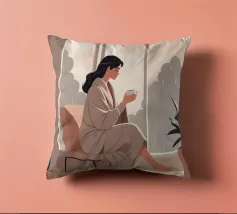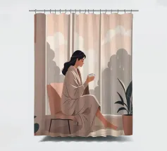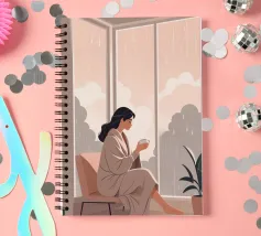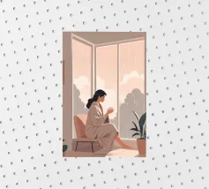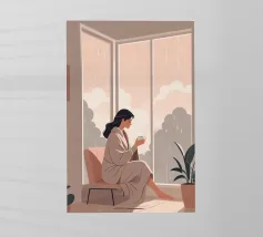 Una morbida illustrazione minimalista di una donna che sorseggia un caffè accanto alla finestra mentre fuori cade dolcemente la pioggia. Perfetta per chi ama i momenti di intimità, le coperte calde e il suono calmo della pioggia.