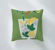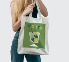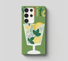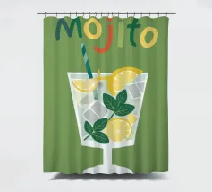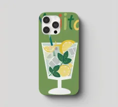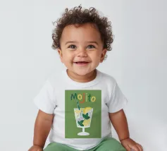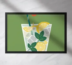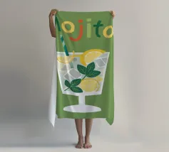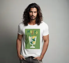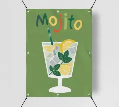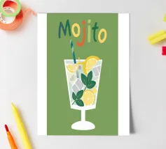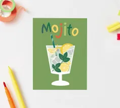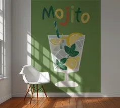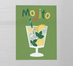 Un'illustrazione grafica brillante e vivace di un cocktail mojito in un bicchiere, con la tipografia 'Mojito' in alto, su un vivace sfondo verde lime.