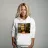 Monna Lisa indossa un buffo maglione natalizio e un cappello con corona di carta natalizia. Sul suo pullover natalizio ci sono due pudding natalizi e un albero di Natale alle sue spalle.
