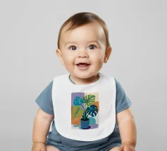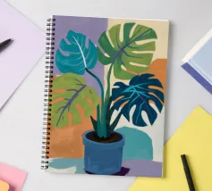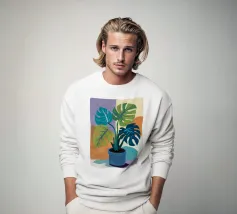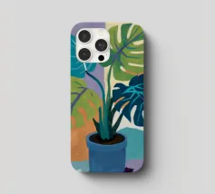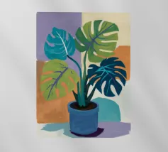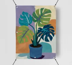 Natura morta contemporanea di una pianta di monstera in un vaso blu. Lo sfondo è un'audace composizione di forme astratte a colori bloccati nei toni della terra, che fonde forme naturali e arte moderna.