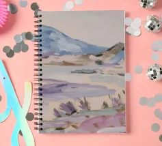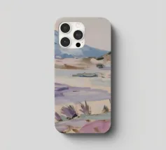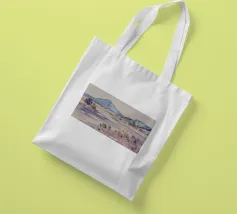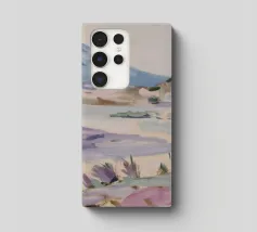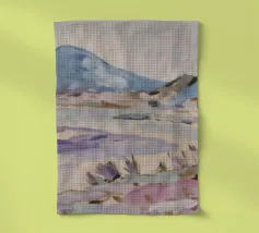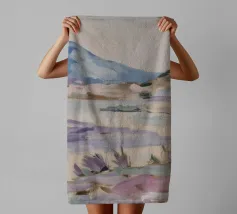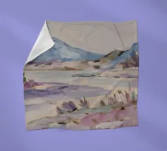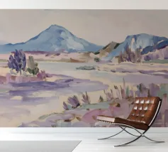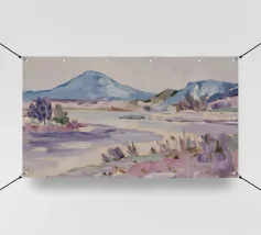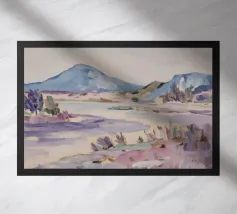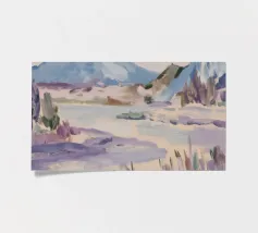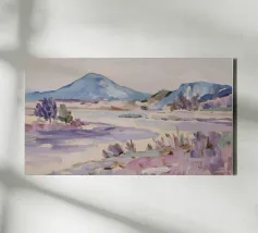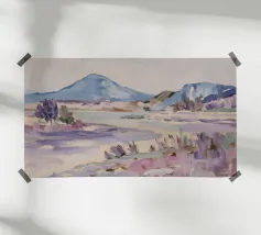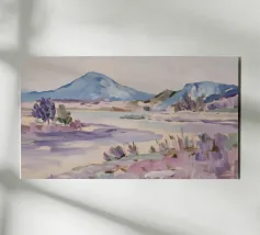 Un paesaggio minimalista e d'atmosfera, forse un acquerello, che ritrae una catena montuosa lontana e nebulosa attraverso un sereno specchio d'acqua o un vasto terreno pianeggiante, sotto un cielo vasto e pallido, reso con colori tenui e sfumati.