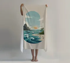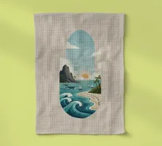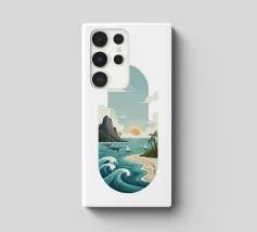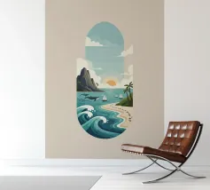 Una serena illustrazione minimalista di design piatto che cattura una vibrante scena oceanica al tramonto. Presenta onde ondeggianti, una spiaggia sabbiosa con impronte di piedi, palme, barche a vela lontane, maestose balene e aspre montagne costiere sotto un cielo parzialmente nuvoloso. L'opera d'arte utilizza una tavolozza rinfrescante di blu, verdi e toni caldi del tramonto per evocare tranquillità e avventura. Oceano, Mare, Spiaggia, Tramonto, Onde, Palme, Barche a vela, Balene, Costa, Montagne, Minimalista, Flat Design, Illustrazione, Tranquillità, Avventura, Digital Art