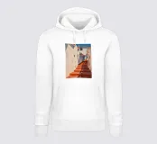 Uno stretto passaggio illuminato dal sole tra edifici bianchi è caratterizzato da una serie di scale rosso cremisi che creano una composizione audace, grafica e architettonicamente interessante, ricca di fascino mediterraneo.