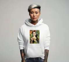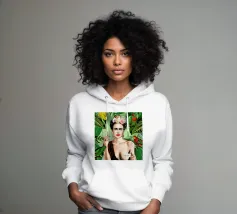 Frida Kahlo gusta il suo caffè in una tazza di fiori, circondata da elementi botanici e accenti floreali. Il suo autoritratto emana eleganza e stile boho, mentre i verdi tenui e i toni della terra sottolineano la sua bellezza naturale.