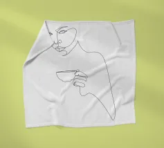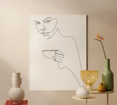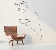 Disegno al tratto astratto e minimale di giovane donna con una tazza di bevanda calda