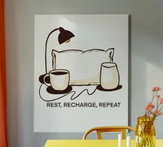 Un'ambientazione accogliente è caratterizzata da un cuscino, una lampada e due tazze, che evocano un senso di relax. La frase "Riposare, ricaricare, ripetere" rafforza il tema della calma e del ringiovanimento.