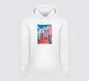 Quest'opera d'arte cattura la bellezza iconica di un'isola greca con i suoi gradini vivaci e colorati nei toni del rosa, dell'arancione e del rosso. La classica architettura bianca e blu incornicia la scena, creando un'immagine gioiosa e pittoresca che trasporta immediatamente in un vicolo soleggiato di Santorini.