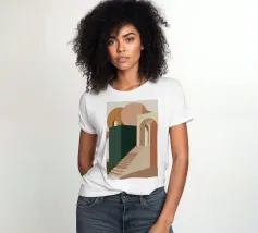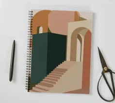 Una scena architettonica inondata di sole di una scala che sale attraverso eleganti archi. I toni caldi e terrosi e le forti ombre evocano un senso di bellezza senza tempo e di pacifica ascesa, tipico del design mediterraneo.