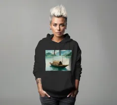 Una barca solitaria riposa pacificamente su un lago di montagna cristallino, circondato da cime imponenti e avvolte dalla nebbia e da una vegetazione lussureggiante. L'acqua a specchio riflette la bellezza senza tempo del paesaggio, creando una scena che sembra non essere stata intaccata dal tempo. Perfetto per portare calma e ispirazione in qualsiasi ambiente.