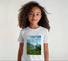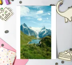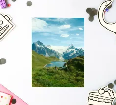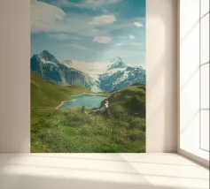 Rilassatevi e abbracciate la bellezza mozzafiato delle Alpi svizzere con questa tranquilla scena di prati smeraldini, laghi di montagna cristallini e cime maestose sotto un vasto cielo blu. Perfetto per aggiungere calma e ispirazione a qualsiasi spazio.