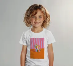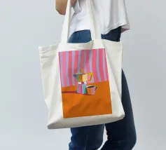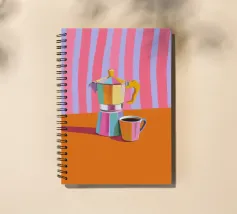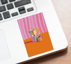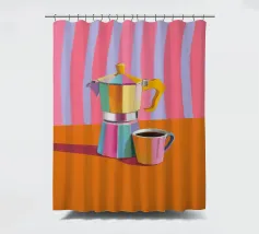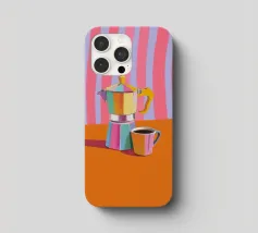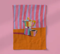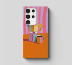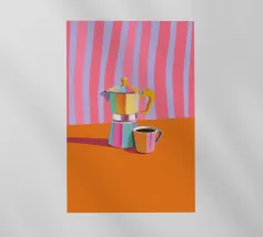 Una caffettiera e una tazza poggiano su una superficie arancione vivace, in contrasto con il rosa e il rosso a strisce, irradiando tranquillità.