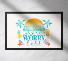 Siete pronti per una vacanza e avete voglia di sole, mare e spiaggia. Allora questo motivo con alba, palme, cocktail rinfrescanti, ananas fresco e conchiglie è proprio quello che fa per voi. Detto umoristico per l'estate. Concedetevi più spiaggia e preoccupatevi di meno.