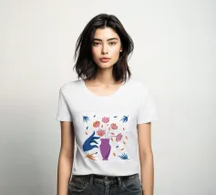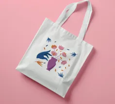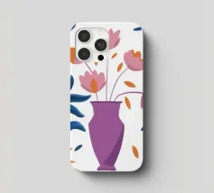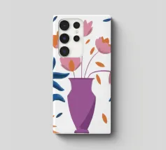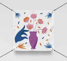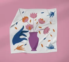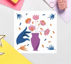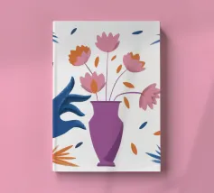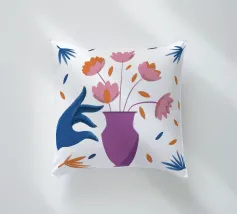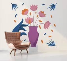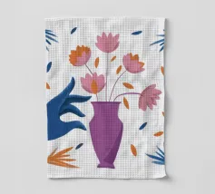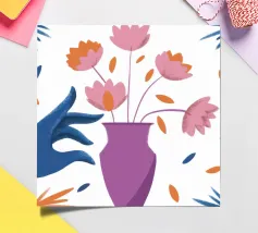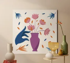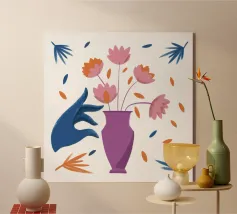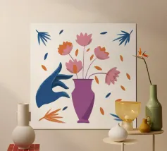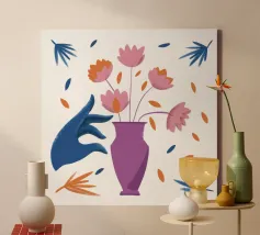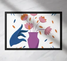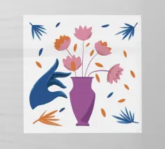 Illustrazione minimalista ed elegante di una mano blu scuro che dispone delicati fiori e foglie rosa in un vaso viola.