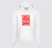 "Il mondo è tuo!" - Un avventuroso motivo estivo nelle vivaci tonalità del rosa, del rosso e dell'arancione. Questo disegno tipografico ispira viaggi ed esplorazioni, mentre il carattere audace incarna libertà e possibilità.