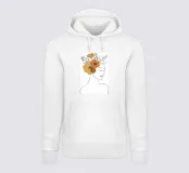 Un disegno al tratto minimalista raffigura il profilo di una donna dall'espressione serena. I suoi capelli sono ornati da grandi fiori stilizzati di colore arancione e giallo e da foglie delicate.