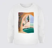 Un'illustrazione tropicale in un ambiente mediterraneo. La panchina invita a sognare in questo ambiente estivo.