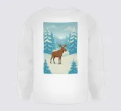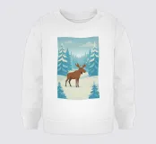 Design minimalista con un alce in una foresta di conifere con abeti o abeti rossi coperti di neve. Design decorativo invernale con un tipico animale selvatico scandinavo, originario tra l'altro di Svezia, Norvegia e Finlandia.