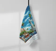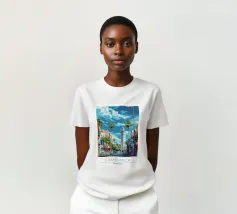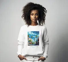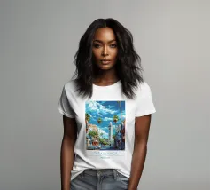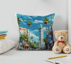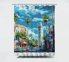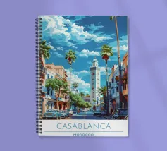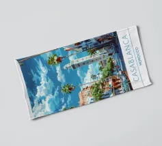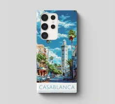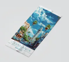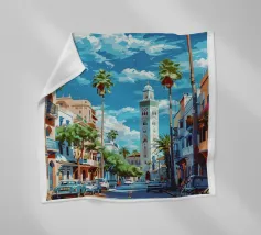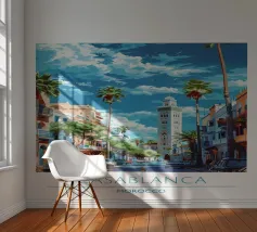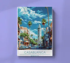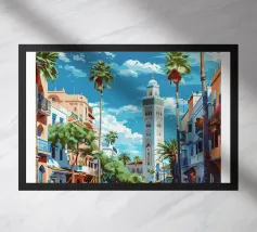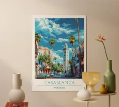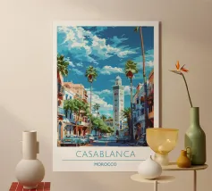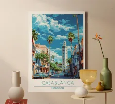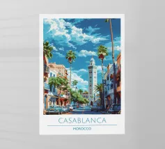 Catturate l'atmosfera vibrante e solare di Casablanca, in Marocco, con questa accattivante stampa d'arte digitale. L'immagine presenta un'animata strada della città fiancheggiata da alte palme e affascinanti edifici, al centro della maestosa torre bianca di una moschea (minareto). Realizzata in un vivace stile da poster di viaggio vintage con colori saturi, l'opera d'arte fonde magnificamente la vita moderna della città con l'architettura storica del Nord Africa. Questo download digitale premium viene fornito con una brillante risoluzione di 7000x5000 pixel a 300 dpi, che garantisce una chiarezza eccezionale e colori vividi per una stampa di alta qualità.