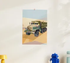 Illustrazione di un'auto da corsa con una combinazione di colori unica sulla strada con uno stile geometrico moderno.