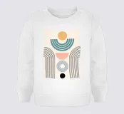 Le forme geometriche sono disposte in una composizione equilibrata con cerchi, archi e semicerchi in tonalità tenui. Il design è caratterizzato da un gioco di linee e forme che creano un senso di simmetria e armonia.