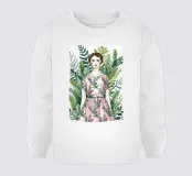 Avvolta da motivi floreali, una figura si erge con grazia tra la vegetazione lussureggiante. Foglie vibranti e petali rigogliosi incorniciano la loro silhouette, formando un ipnotico tableau naturale.