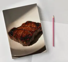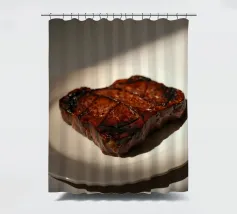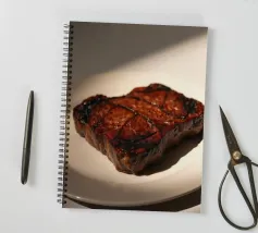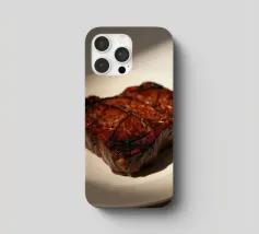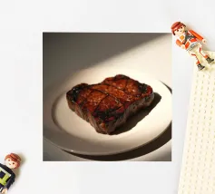 Una bella bistecca alla griglia è adagiata su un piatto bianco, ornato dai segni della griglia. La calda luce del sole mette in risalto i suoi colori ricchi, creando un'atmosfera invitante perfetta per il pranzo.