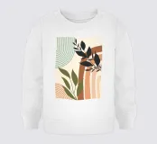 Foglie stilizzate in nero e verde si stagliano su uno sfondo di strisce curve e fluide in morbide tonalità di terra. Il disegno combina elementi botanici con forme geometriche astratte per un look moderno.