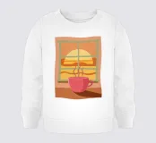 Un'illustrazione semplice e confortante di una tazza rosa di caffè o tè fumante, appoggiata a una finestra con vista sul sole che sorge. La scena cattura perfettamente il calore e la speranza di un nuovo mattino.