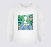 Una persona con lunghi capelli verdi tiene in mano una tazza gialla, seduta davanti a una finestra con piante e una tenda blu.