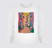 Una vivace illustrazione di uno stretto vicolo acciottolato di una città europea, fiancheggiato da edifici dai colori vivaci e da una vegetazione lussureggiante, piena di vita e di fascino.